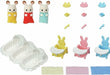 Set includes: Chocolate Rabbit triplet (Flora /red outfit), Chocolate Rabbit triplet (Phillip/yellow outfit), Chocolate Rabbit triplet (Fauna/mint green outfit), Baby chair (pink), Baby chair (yellow), Baby chair (blue), Rabbit plate (pink), Rabbit plate (yellow), Rabbit plate (blue), Mug (pink), Mug (yellow), Mug (blue), Rabbit spoon (pink), Rabbit spoon (yellow), Rabbit spoon (blue), Cradle, Blanket (pink), Blanket (cream), Blanket (blue) (a total of 19 pieces)