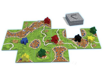 Carcassonne is a tile-placement game in which the players draw and place a tile with a piece of southern French landscape on it. The tile might feature a city, a road, a cloister, grassland or some combination thereof, and it must be placed adjacent to tiles that have already been played, in such a way that cities are connected to cities, roads to roads, etcetera. Having placed a tile, the player can then decide to place one of their meeples on one of the areas on it: on the city as a knight, on the road as a robber, on a cloister as a monk, or on the grass as a farmer. When that area is complete, that meeple scores points for its owner.