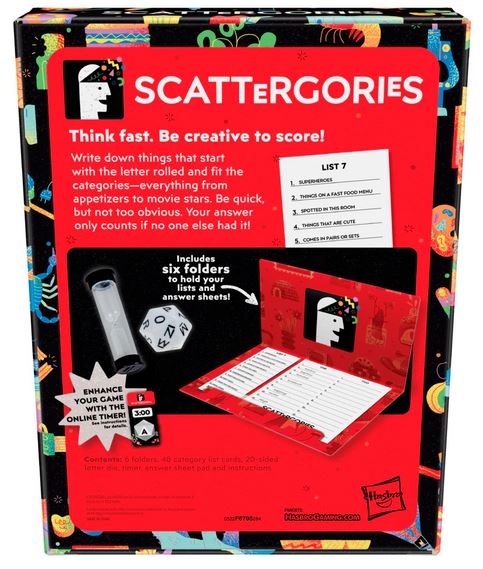 CLASSIC QUICK-WIT CATEGORIES GAME:Â Try to outwit other players by coming up with unique answers in this version of the fast-paced Scattergories party game for adults and teens