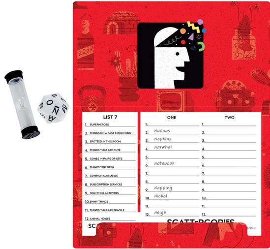THINK FAST AND BE CREATIVE TO SCORE:Â In the classic Scattergories game, write down things in each category that start with the letter rolled -- from appetizers to movie stars. Your answer only counts if no one else has it. After 4 rounds, the player with the most points wins!
