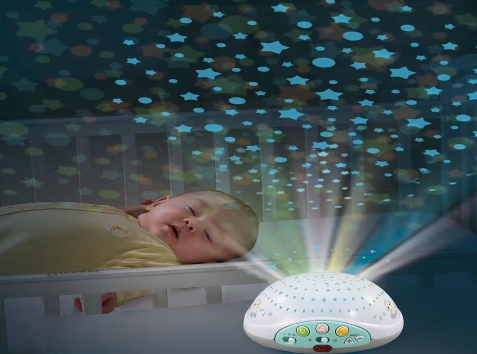 Help your baby drift off to dreamland with the VTech Lullaby Lambs Mobile. Your little one can watch as three fluffy sheep spin around on the mobile while a calming night sky is projected onto the ceiling in three different colours. As your baby grows, the projector can be removed, placed on a dresser and used as a light projector and music player. Parental controls let you customize the mobile by adjusting the volume, light projection, spinning and sounds. The remote control allows you to play or pause the music and sounds and adjust the volume within a 30 foot range without entering the room. The sound sensor reactivates soothing music or sounds when your baby cries. Sweet dreams! Fits cots with spacing between bars that is between 2.5cm to 11.6cm and top rail width that is no more than 5.8cm